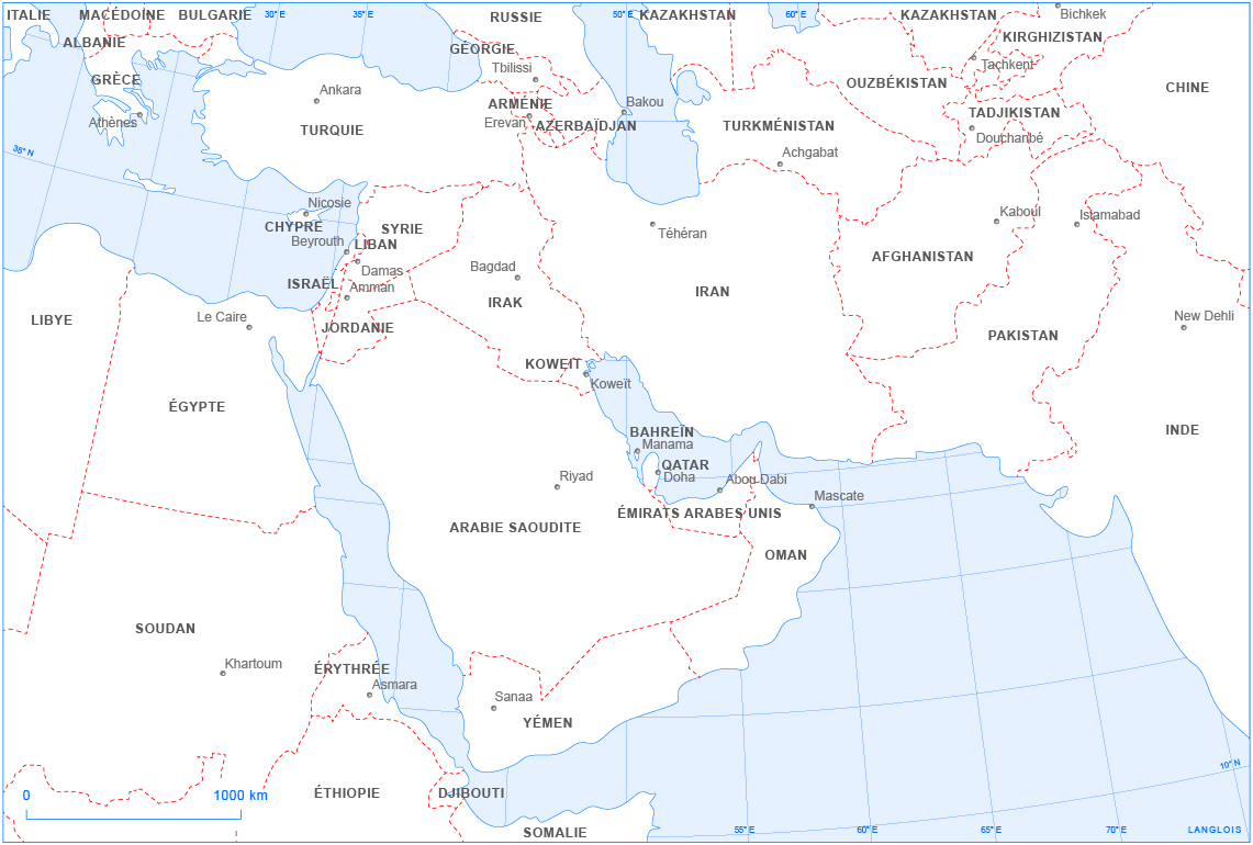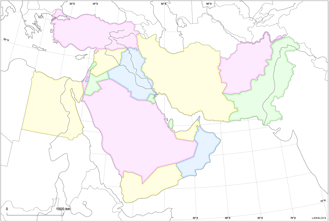 Les deux expressions de « Proche » et de « Moyen-Orient » naissent en « Occident » et témoignent de l’intérêt porté à la région par les puissances occidentales. La première apparaît dans les années 1890 pour désigner l’Orient proche, par opposition à l’Extrême-Orient (Asie orientale) : elle désigne la partie orientale du bassin méditerranéen, théâtre de la « question d’Orient ». La seconde (en anglais, Middle East) est employée en 1902, par l’amiral et stratège états-unien Alfred Mahan, pour désigner des régions comprises entre l’Orient proche et l’Orient extrême (péninsule arabique, golfe Persique, Iran). Elle prend une signification plus large au cours du XXe siècle et désigne désormais l’ensemble des régions comprises entre le Nil et l’Indus, la mer Noire et la mer Arabique (mer d’Oman). Le Moyen-Orient finit par absorber le Proche-Orient. La région fait donc l’objet de délimitations différentes. Les fonds de carte ci-après adoptent par convention les limites suivantes : du Nil à l’Indus, de la mer Noire à la mer d’Oman ou mer d’Arabie, du détroit de Bab-el-Mandeb au corridor du Wakhan, ce qui inclut deux États classés selon les cas en Asie du Sud ou au Moyen-Orient — l’Afghanistan et le Pakistan. Dans l’édition 1997 de L’état du monde. Annuaire économique et géopolitique mondial, ils constituent, avec l’Iran, le « Moyen-Orient » au sens strict.