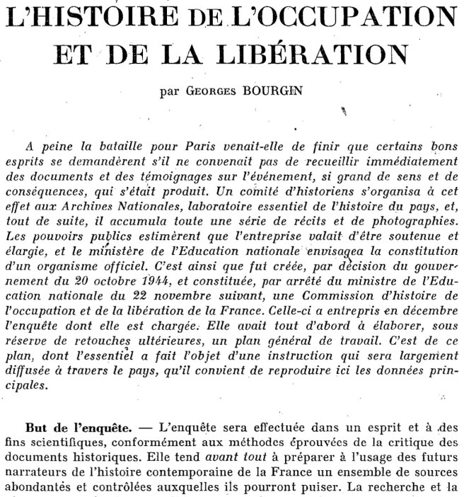 Dans un texte publié par la revue La Pensée (octobre-décembre 1945), Georges Bourgin, archiviste paléographe et directeur honoraire des Archives de France, rappelle dans quelles circonstances fut créée la Commission d’histoire de l’occupation et de la libération de la France et expose les buts et les méthodes de l’enquête qu’elle entend conduire.