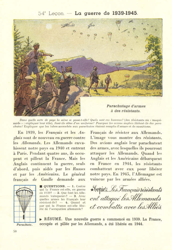 La leçon est extraite d’un manuel d’histoire publié en 1952, destiné à la première année du cours élémentaire et conforme au programme de 1945 : Albert Troux, Histoire de la France. Premier livre, Paris, Hachette, 1952, p. 58. Elle est sans doute conforme à la thèse résistancialiste, mais il ne faut pas généraliser sans précaution à partir de ce seul exemple.