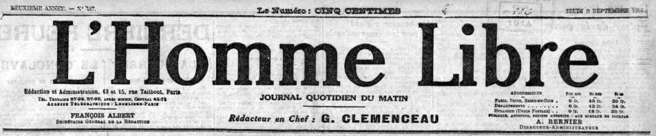 En septembre 1914, dans L’Homme libre, Clemenceau publie un éditorial qui dénonce les défaillances du Service de santé des armées. « Des blessés ont dû voyager, écrit-il, simplement étendus sur la paille noire des wagons qui venaient d’être employés pour le transport des chevaux. » Le journal est saisi le 29 avant d’être suspendu pour huit jours. Pour tourner l’interdiction, Clemenceau le publie sous un titre différent, L’Homme enchaîné, mais le journal est saisi de nouveau et ne reparaît que le 8 octobre. Dans un nouvel éditorial, Clemenceau réfute les explications apportées par le Service de santé, mais la censure lui impose des coupures laissées en blanc dans le texte.