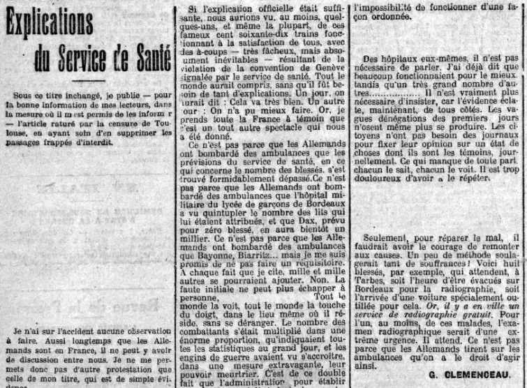 Ce n’est pas parce que les Allemands ont bombardé des ambulances que les prévisions du Service de santé, en ce qui concerne le nombre des blessés, s’est trouvé formidablement dépassé. Ce n’est pas parce que les Allemands ont bombardé des ambulances que l’hôpital militaire du lycée de garçons de Bordeaux a vu quintupler le nombre des lits qui lui étaient attribués, et que Dax, prévu pour zéro blessé, en aura bientôt un millier. Ce n’est pas parce que les Allemands ont bombardé des ambulances que Bayonne, Biarritz… mais je me suis promis de ne pas faire un réquisitoire. À chaque fait que je cite, mille et mille autres se pourraient ajouter.