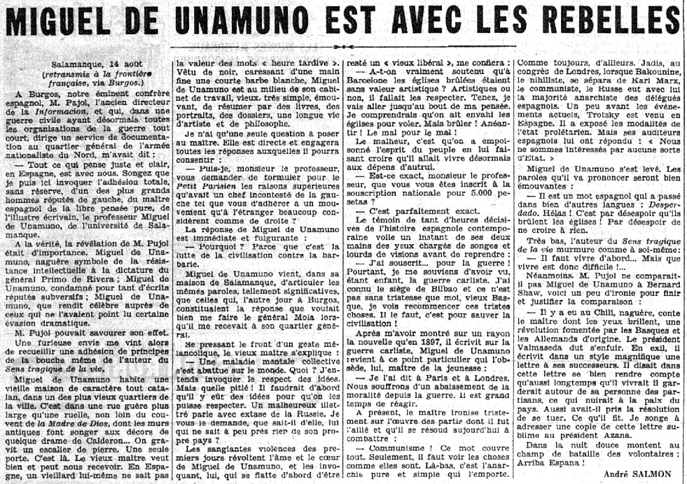 Le 15 août 1936, Le Petit Parisien publiait un entretien d’André Salmon avec Miguel de Unamuno, lequel s’expliquait sur les « raisons supérieures qu’avait un chef incontesté de la gauche […] d’adhérer à un mouvement qu’à l’étranger beaucoup considèrent comme de droite ». Deux mois plus tard, il prononce le discours de Salamanque : « Il y a des circonstances où se taire est mentir… »