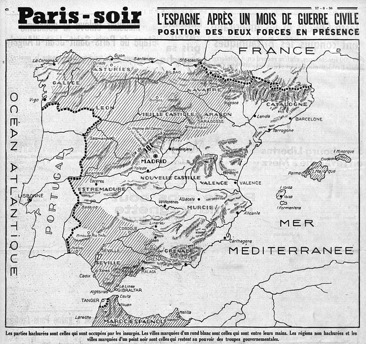 Carte : « L’Espagne après un mois de guerre civile : position des forces en présence », Paris-soir, 17 août 1936.