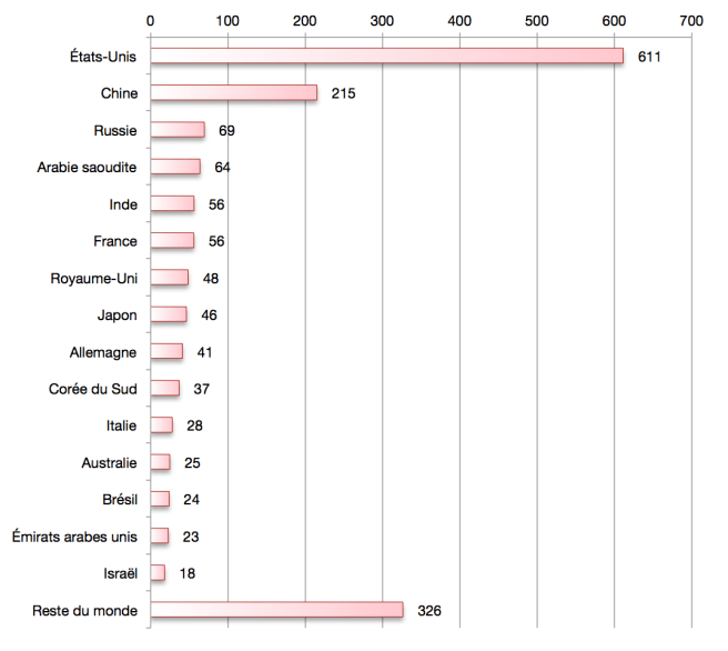 Les données sont extraites d’un rapport annuel de l’Institut international de recherche sur la paix de Stockholm (Stockholm International Peace Research Institute, SIPRI), avril 2017 :