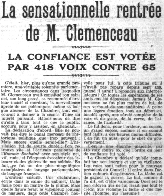 Reçu par le président de la République, pour consultation, le 14 novembre à 14 h, Clemenceau revient à l’Élysée le 15 à 15 h et annonce à son départ qu’il accepte de former le nouveau gouvernement, ce qu’il fait en vingt-quatre heures. Son dernier éditorial, publié au matin du 15, dans L’Homme enchaîné, s’intitulait : « On demande un gouvernement ». Devenu président du Conseil et ministre de la Guerre, il présente son cabinet au président le 16 à 16 h, paraît devant la Chambre dans l’après-midi du 20 et donne lecture de sa déclaration ministérielle à 15 h 15. On trouvera ci-dessous le texte complet d’un discours souvent cité — mais rarement dans son entier — et sa traduction en anglais dans The New York Times Current History. La déclaration ministérielle est suivie d’un vote de confiance et Clemenceau le sollicite expressément, mais le terme d’investiture ne figure pas dans le texte constitutionnel. Les lois de 1875 établissent un régime parlementaire, mais les rapports entre les pouvoirs sont fixés, en grande partie, par la pratique politique : crise du 16-Mai (1877), doctrine Grévy (6 février 1879), etc. Le 20, Clemenceau obtient la confiance de la Chambre par 418 voix contre 65.