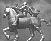 Malheureusement, le régime a imprimé sa marque déplaisante sous les traits d’un monsieur, violemment argenté, assis tout nu sur son cheval, et qui représente, paraît-il, le génie du fascisme (est-ce une marque de génie que d’avoir le masque brutal de Mussolini ?). De même, ce petit dais moyenâgeux, sorti d’on ne sait où au milieu d’un décor tout classique.