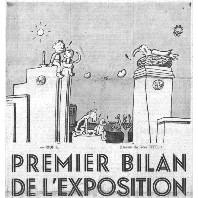 L’Exposition internationale des arts et techniques dans la vie moderne se tient à Paris du 25 mai au 25 novembre 1937. Dans son édition datée du 25, jour de clôture de l’Exposition, Paris-soir publie un dessin de Jean Effel. On y reconnaît la sculpture respective de chacun des deux pavillons soviétique et allemand — le couple à la faucille et au marteau (L’Ouvrier et la Kolkhozienne de Moukhina), une aigle allemande tenant dans ses serres une croix gammée laurée — et la statue équestre du pavillon italien (Le Génie du fascisme de Gori). En juin, dans l’hebdomadaire communiste Regards, Lydia Lambert comparait les pavillons des trois pays dans un article intitulé « 4 pavillons, 4 peuples, 4 styles à l’Expo ». En juillet, Marianne publiait un article de Paul Chadourne sur le Guernica de Picasso exposé au pavillon de l’Espagne.