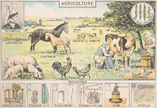 L’atlas scolaire d’Alcide Lemoine et Amédée Marlot est publié en 1912 sous le titre : La géographie enseignée par les yeux. Étude descriptive basée sur des notions élémentaires de géologie. Destiné au cours moyen, il présente les régions françaises au moyen d’une série de « gravures coloriées ». Ci-après : 1. La Normandie ; 2. La Champagne ; 3. Les Alpes ; 4. Biskra et le Sahara.