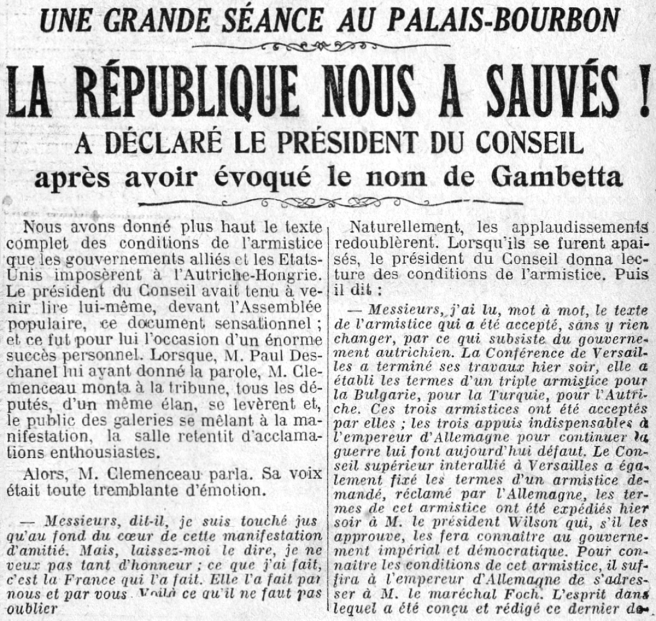 À la une de son édition du 6 novembre 1918, L’Œuvre reprend les propos tenus la veille par le président du Conseil : « La République nous a sauvés ! a déclaré le président du Conseil après avoir évoqué le nom de Gambetta ».