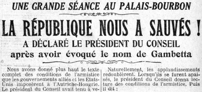 À la une de son édition du 6 novembre 1918, L’Œuvre reprend les propos tenus la veille par le président du Conseil : « La République nous a sauvés ! a déclaré le président du Conseil après avoir évoqué le nom de Gambetta ».