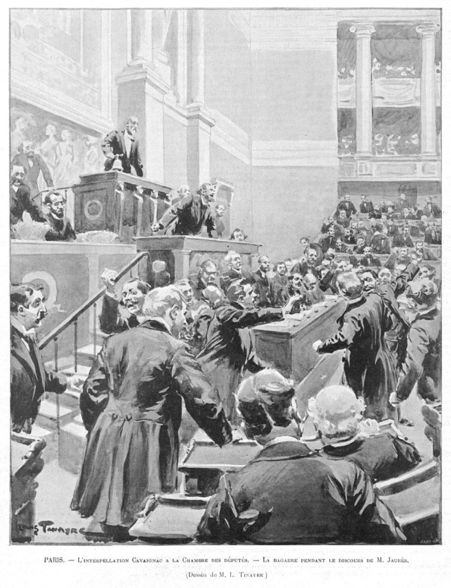 « Paris. — L’interpellation Cavaignac à la Chambre des députés. — La bagarre pendant le discours de M. Jaurès. (Dessin de M. L. Tinayre) »