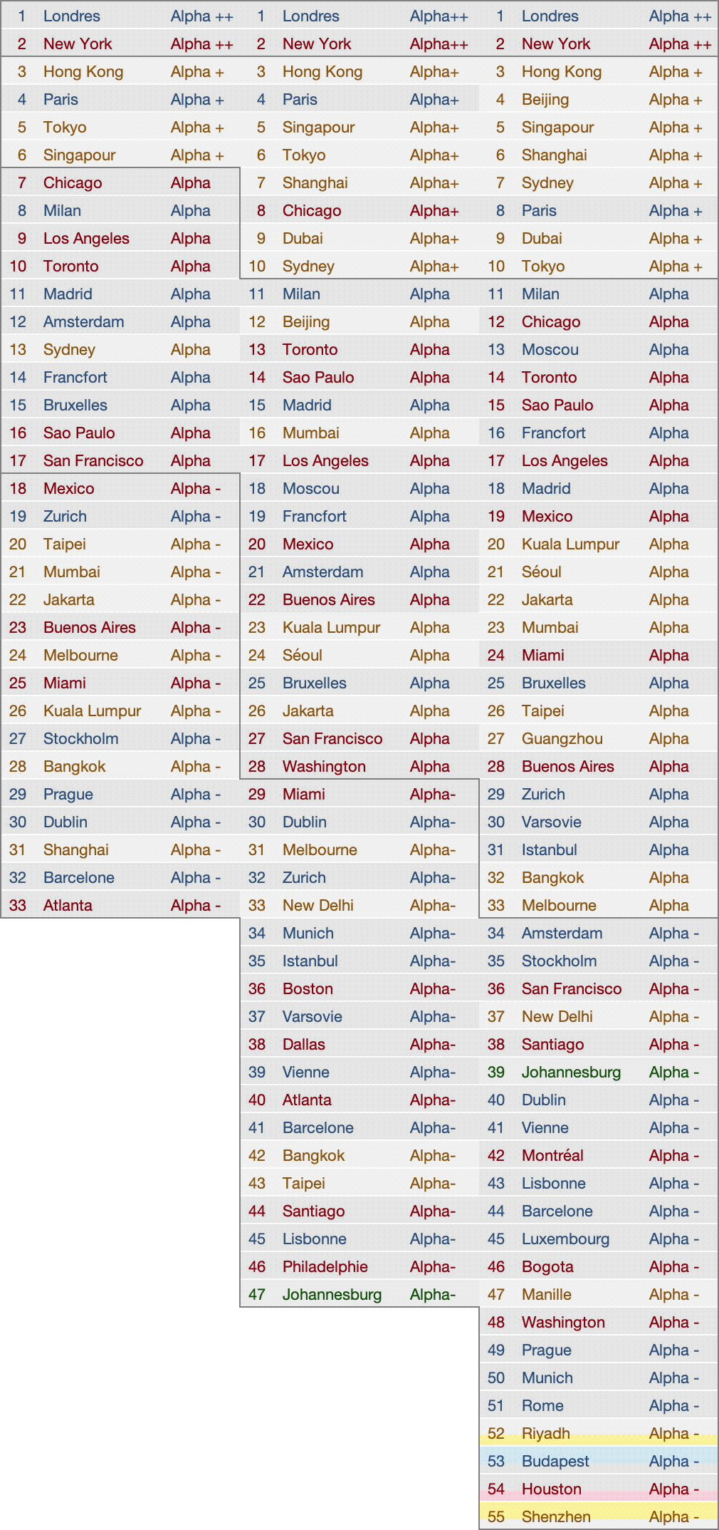 The World According to GaWC 2018, dernière édition du classement, est publié le 13 novembre 2018. L’édition précédente, The World According to GaWC 2016, datait du 31 mars 2017 (mise à jour, 13 novembre 2018). Le classement du GaWC examine la puissance ou la centralité des villes dans la mondialisation : il est fondé sur la place de chacune des villes dans le réseau des firmes de services supérieurs aux entreprises. Il comprend cinq catégories : Alpha, Beta, Gamma, High sufficiency, Sufficiency. On trouvera ci-dessous la liste des villes classées Alpha en 2000, 2010 et 2018. En couleurs, un classement régional élémentaire : Amérique en rouge, Europe en bleu — dans ses limites conventionnelles, Asie et Océanie en jaune, Afrique en vert.