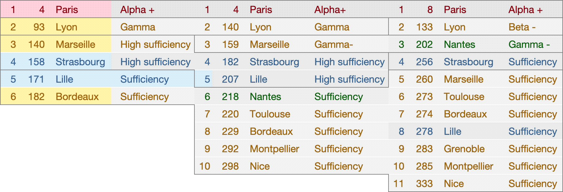 On trouvera ci-dessous la liste des villes françaises classées, dans l’une ou l’autre des catégories, en 2000, 2010 et 2018 : Alpha, Beta, Gamma, High sufficiency, Sufficiency. En couleurs, un classement régional élémentaire : Paris en rouge, l’ouest en vert, le quart nord-est en bleu, la moitié sud en jaune.