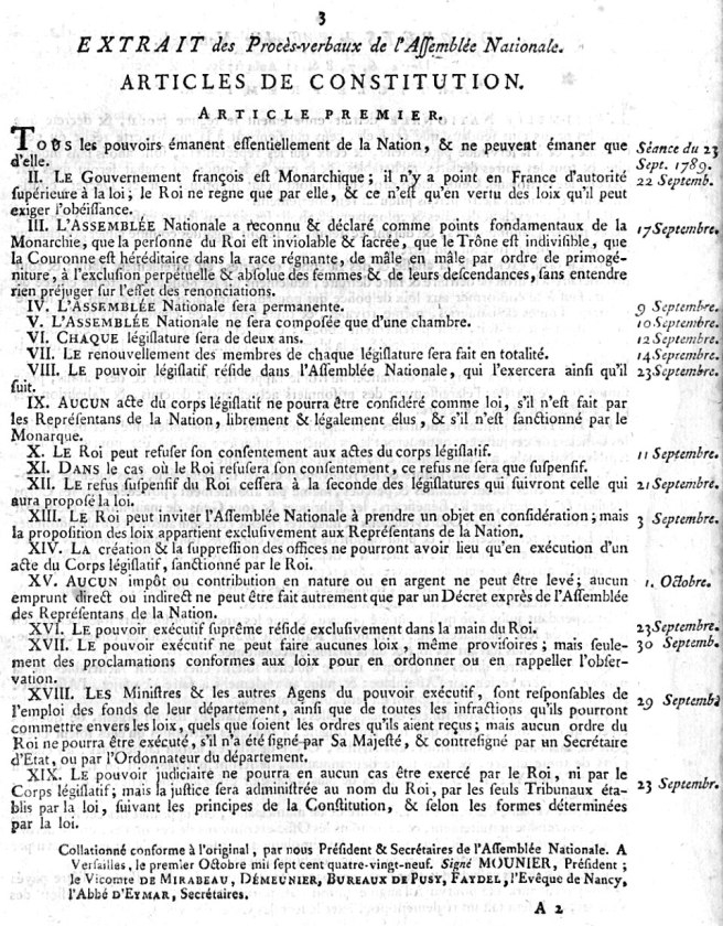 L’Assemblée nationale constituante adopte le texte définitif de la Déclaration des droits et des dix-neuf articles de constitution le vendredi 2 octobre 1789, dans sa séance du matin. Après l’adoption, Mounier, son président, se rend auprès du roi pour lui présenter les deux décrets. À la séance du soir, il instruit l’Assemblée de sa démarche : le roi fera connaître sans délai ses intentions à ce sujet. Le lundi 5 au matin, à l’ouverture de la séance, il donne lecture de la réponse royale, une « accession » partielle — et conditionnelle —, non pas une pleine acceptation. Devant les protestations de la gauche, l’Assemblée décide l’envoi auprès du roi d’une députation afin d’obtenir son « acceptation pure et simple ». Dans la soirée, après l’arrivée des femmes à Versailles, sous la menace de l’émeute, le roi obtempère. Par ses lettres patentes du 3 novembre 1789 — enregistrées par le Parlement, « en vacations », le 17 —, il promulgue la Déclaration, les articles de constitution et les décrets d’août. La Constitution de 1791 est fixée, dans sa rédaction définitive, le 3 septembre 1791, mais ses principales dispositions entrent en vigueur dès 1789.