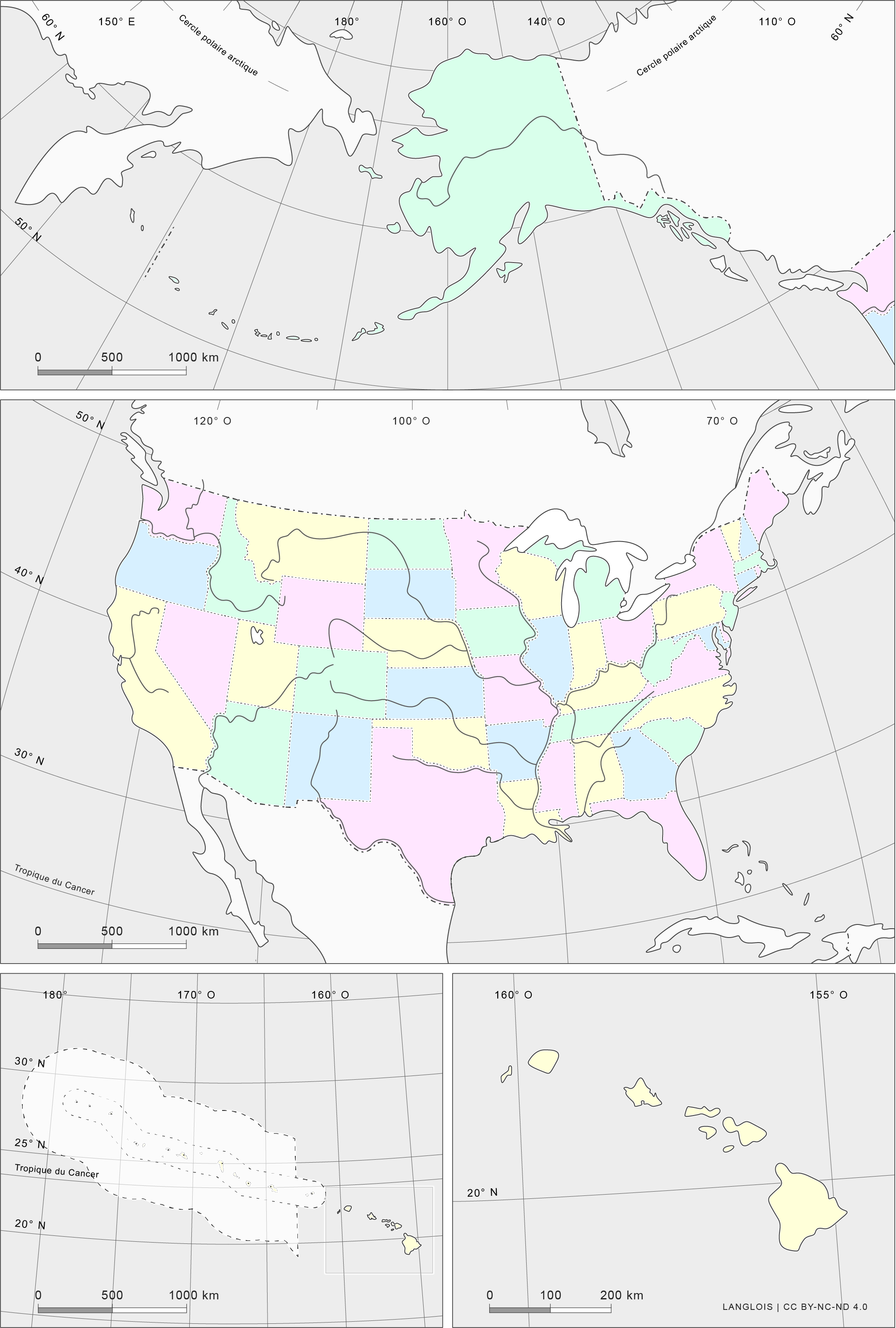 Les États-Unis d’Amérique sont au nombre de cinquante. Les quarante-huit premiers sont adjacents, compris entre les 25e et 49e parallèles de latitude nord. Les deux derniers sont non contigus. Le fond de carte classique figure les premiers sur la carte principale et relègue les derniers dans des cartons annexes, ce qui présente des inconvénients. Ces deux États non contigus sont figurés à des échelles très différentes, petite pour le premier, grande pour le second, ce qui leur donne la même taille apparente alors que la superficie de l’Alaska — premier État de l’Union pour la superficie — est soixante fois supérieure à celle d’Hawaï. Les mêmes États sont en outre amputés d’une partie de leur territoire, les îles Aléoutiennes pour l’Alaska, les îles du Nord-Ouest ou îles Sous-le-Vent pour Hawaï. On trouvera ci-après un fond de carte qui figure les trois ensembles dans leur entier et à la même échelle, leur ajoutant un carton à grande échelle pour la partie principale de l’archipel d’Hawaï.