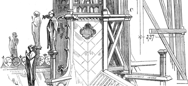 Quelques-unes des statues qui doivent décorer les grandes contre-fiches, dont elle est étayée dans les quatre noues du comble, sont mises en place, et les autres ne tarderont pas à suivre. L’activité imprimée aux autres travaux, tant intérieurs qu’extérieurs, de l’église métropolitaine permet d’assigner une date peu éloignée à leur complet achèvement.