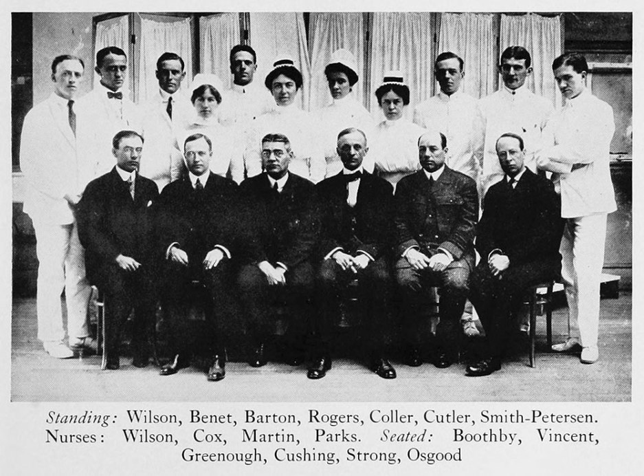 The members of the Harvard University Service which took charge on April 1st, were as follows: Dr. Harvey Cushing, surgeon; Dr. Robert B. Greenough, surgeon and executive officer; Dr. Richard P. Strong, bacteriologist; Dr. Robert B. Osgood, orthopedic surgeon; Dr. Beth Vincent, assistant surgeon; Dr. William M. Boothby, anesthetist; Drs. Fred A. Coller and Elliot C. Cutler, resident surgeons. Drs. Philip D. Wilson, M. N. Smith-Petersen and Lyman G. Barton, Jr., house-officers; Dr. Orville F. Rogers, Jr., medical assistant; Dr. George Benet, laboratory assistant; Misses Edith I. Cox, Geraldine K. Martin, Helen A. Parks and Marion Wilson, operating-room nurses.